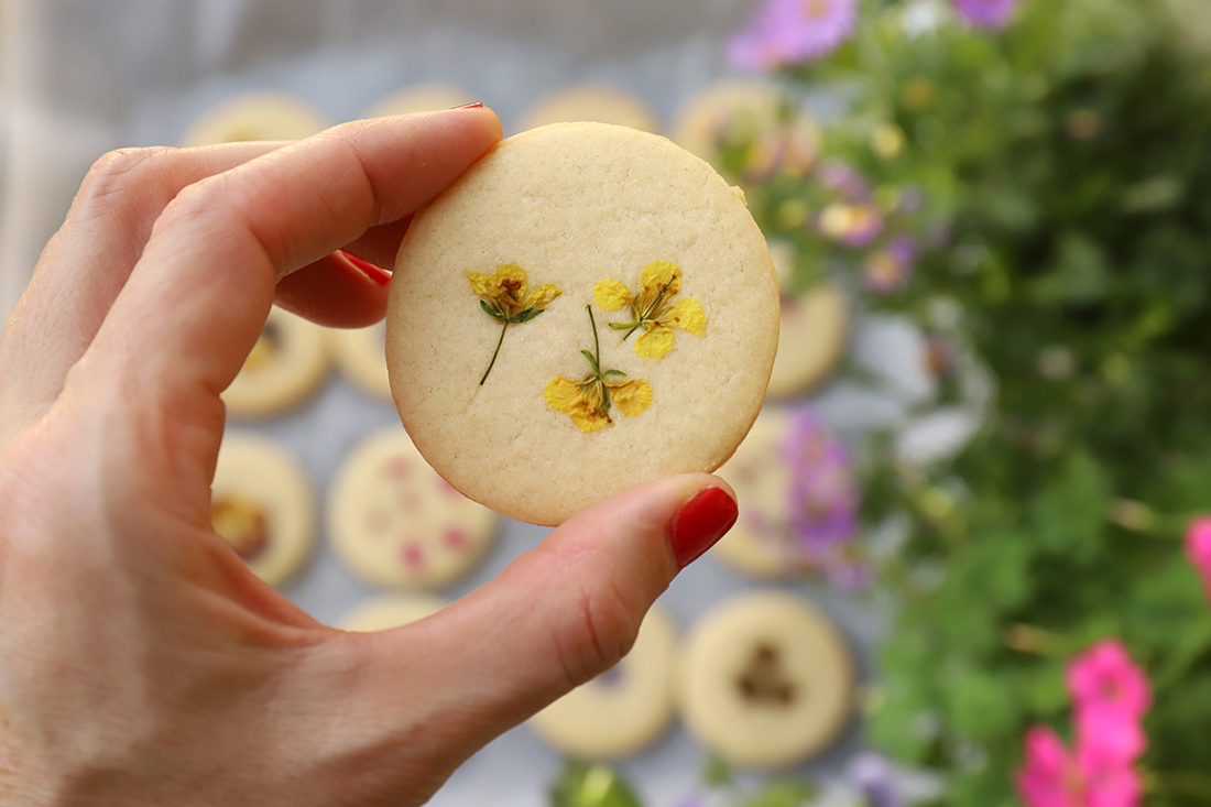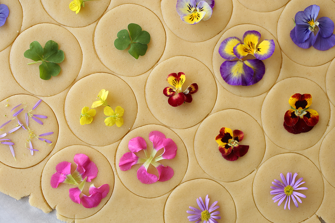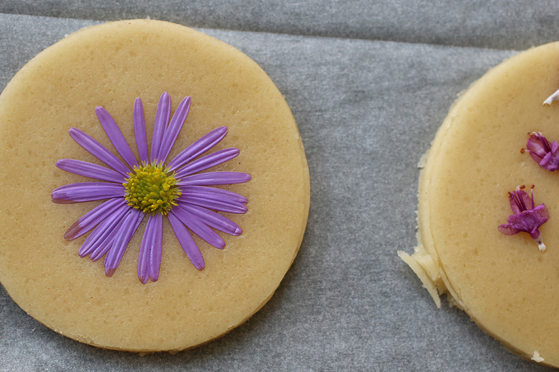 - מניחים פרח על כל עיגול ומכסים שוב בנייר אפייה. מרדדים קלות, רק כדי שהפרחים ימעכו לתוך העוגייה.