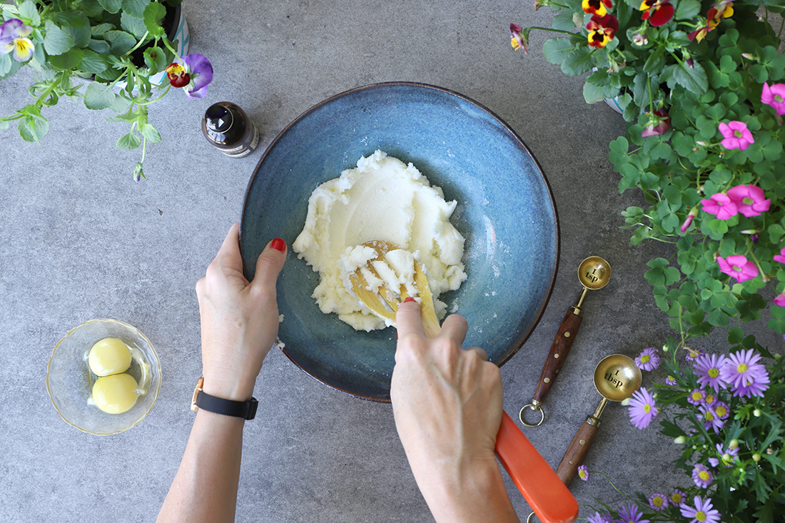 - מערבבים בקערה גדולה בעזרת כף עץ – חמאה, מלח וסוכר לקרם חלק. מוסיפים את החלמונים אחד אחרי השני ומערבבים היטב בין חלמון לחלמון.