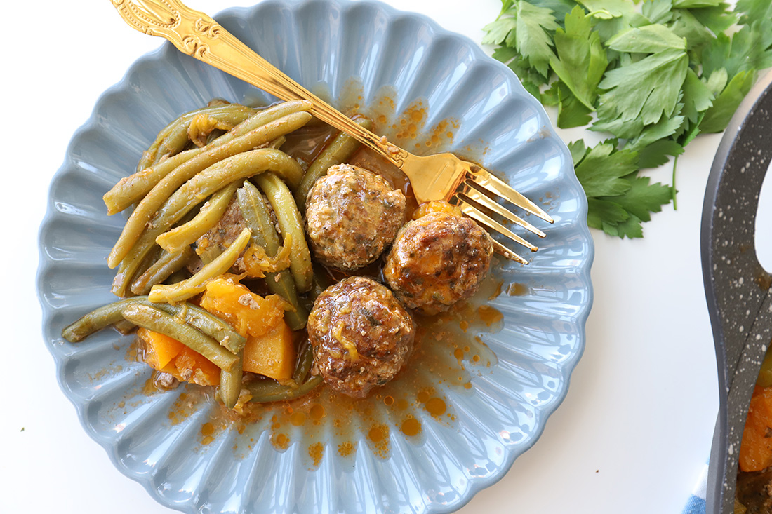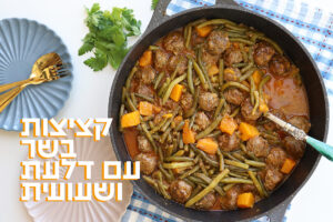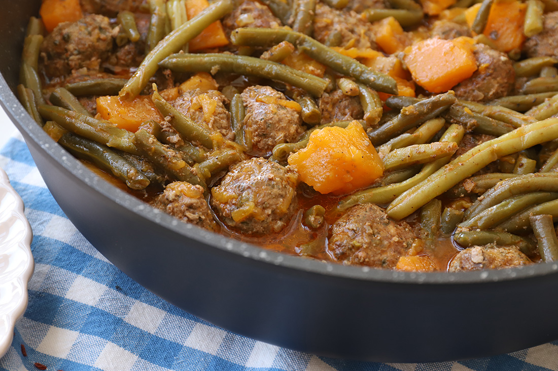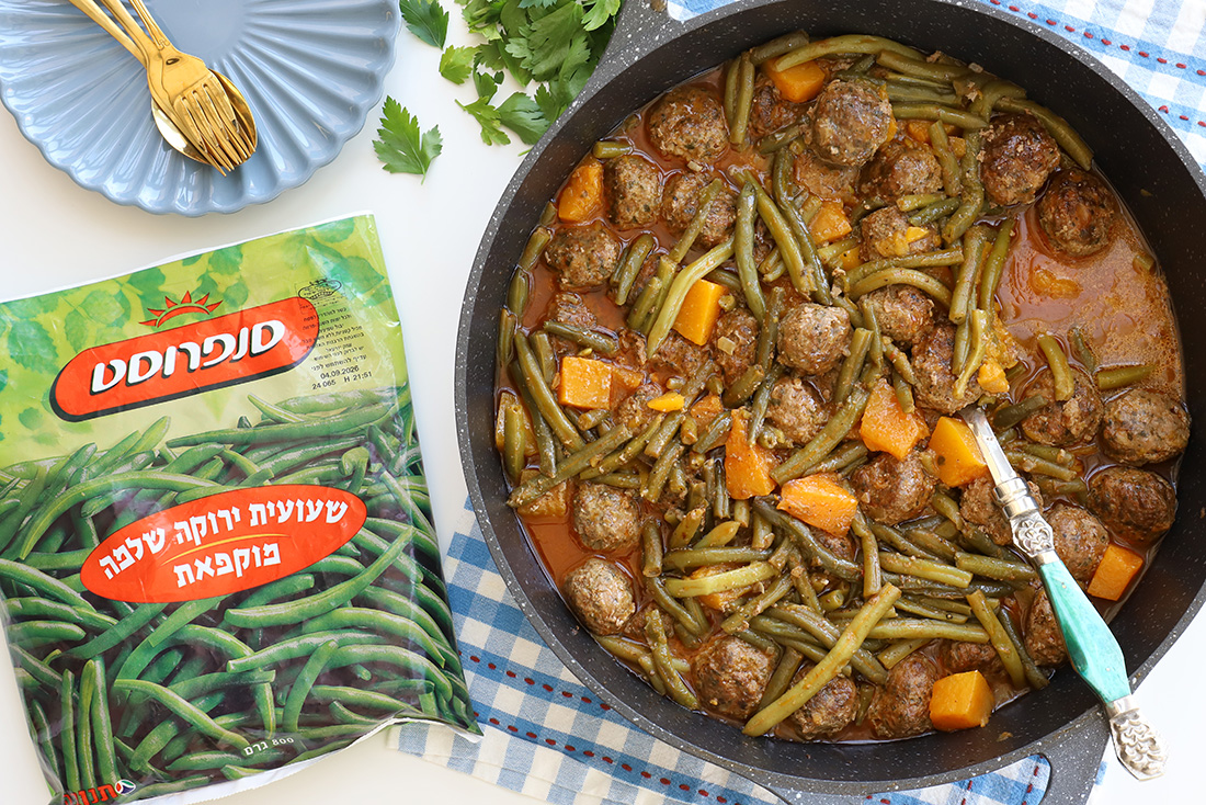 - מוסיפים את הדלעת והשעועית בין הקציצות, אל דאגה אם זה צפוף, הירקות מתכווצים.