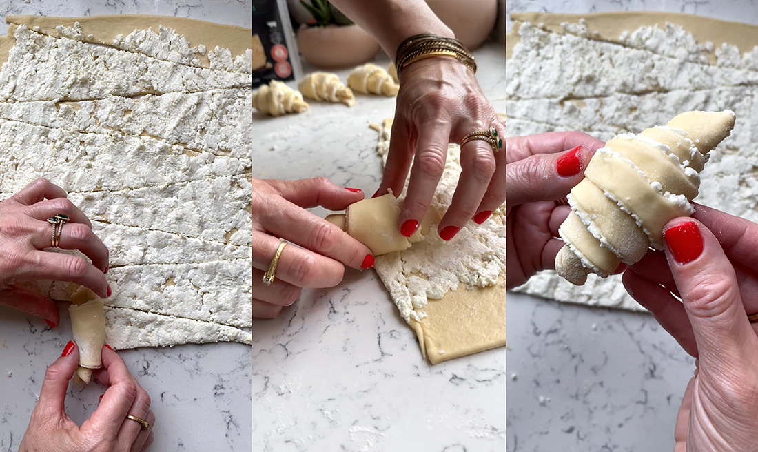 - חותכים למשלושים ארוכים ומגלגלים לצורת רוגעלך.