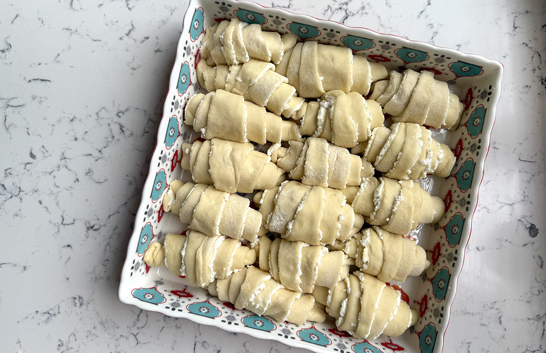 חותכים למשולשים, מגלגלים ככה יפה ומסדרים בתבנית.