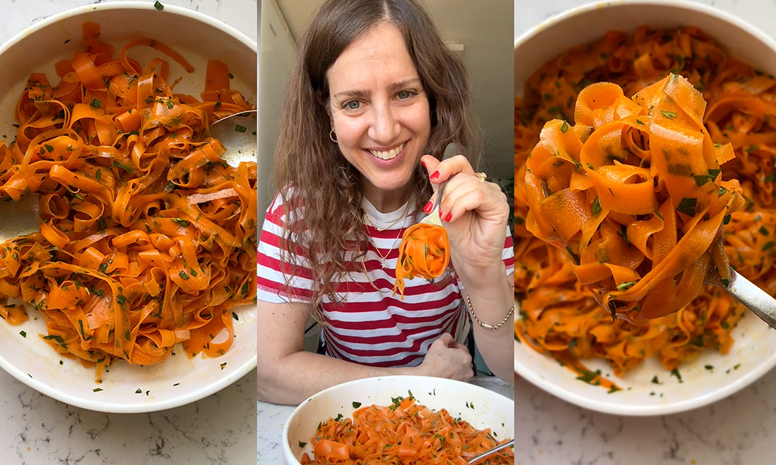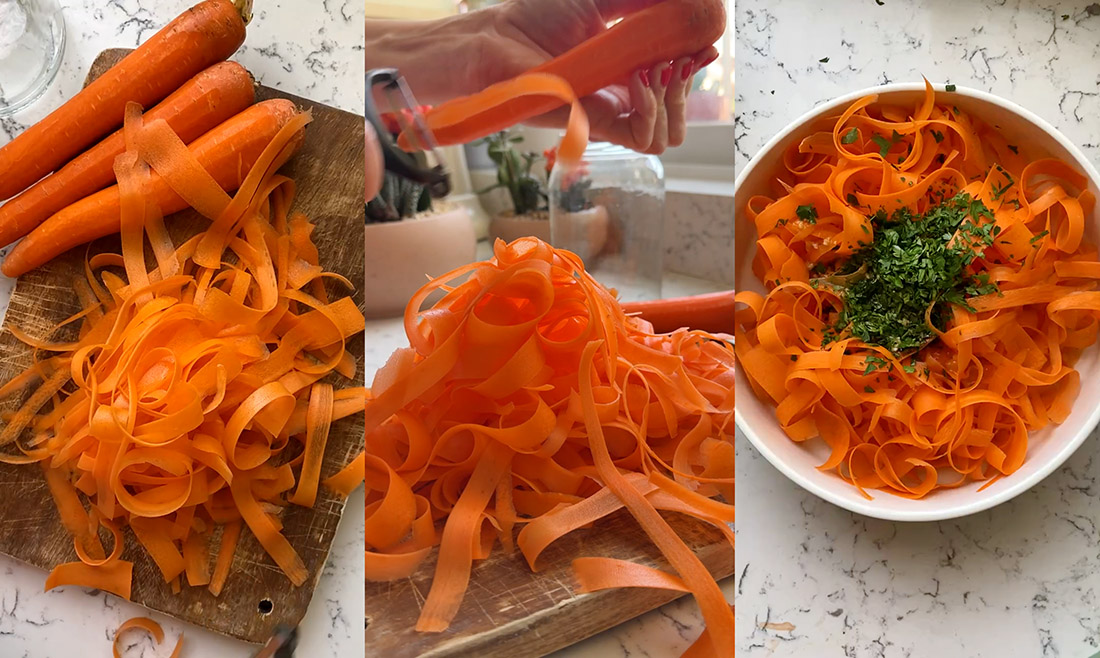 - קולפים את הגזרים, נפטרים מהקליפה החיצונית ואז ממשיכים ליצור סרטים בעזרת קולפן.