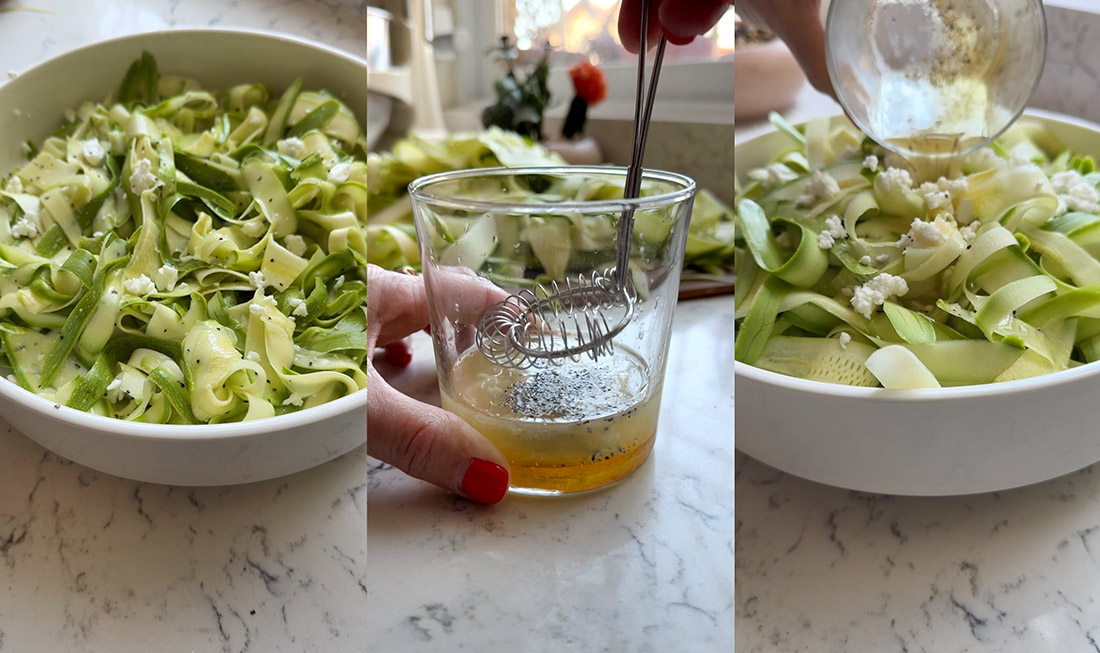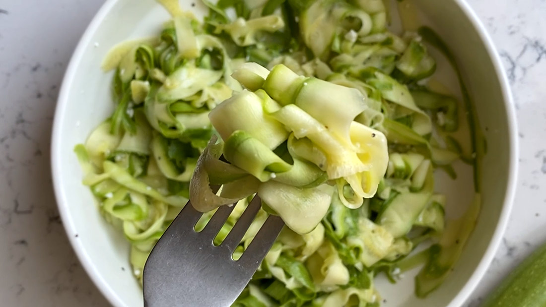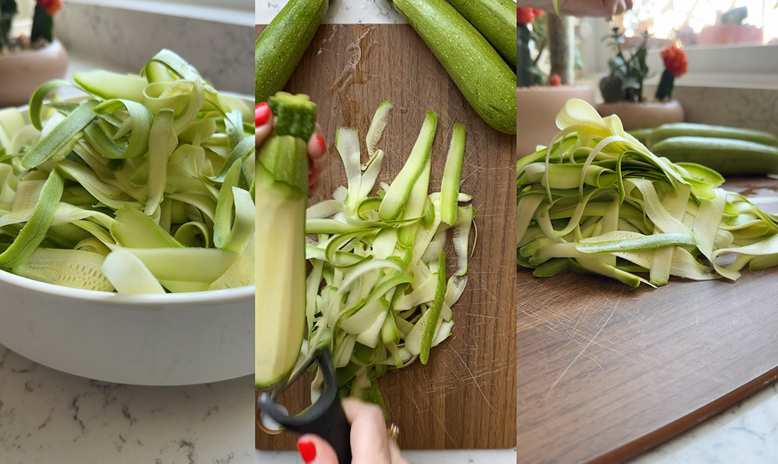 - קולפים את הקישואים בעזרת קולפן, לסרטים ושמים בקערה רחבה. (מקלפים כמעט עד האמצע עד שאין מה להחזיק)