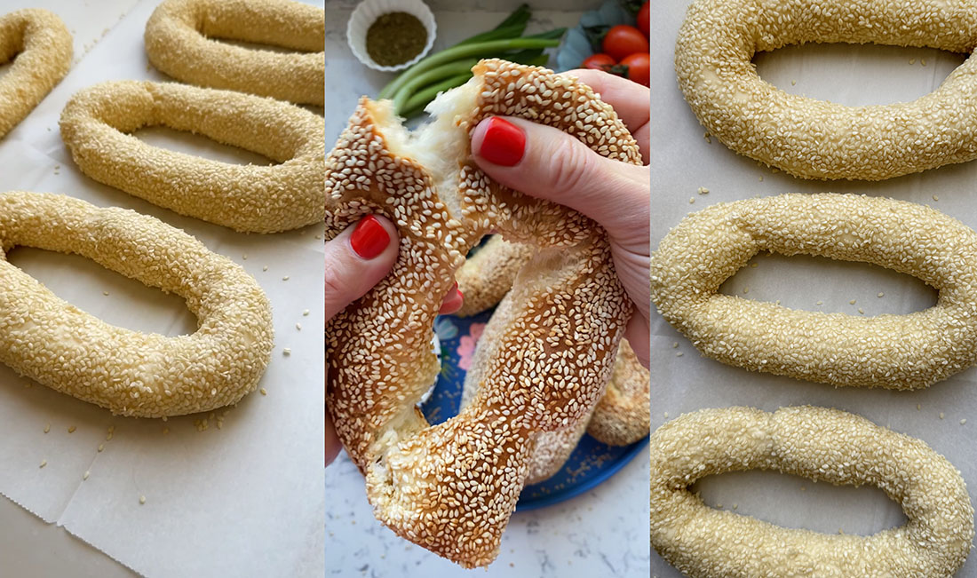 - טובלים כל בייגלה במים ומיד בשומשום. מניחים על תבנית תנור מרופדת בנייר אפייה. מכסים במגבת ומתפיחים עוד 30-45 דקות (תלוי בטמפ׳ בחדר). מדליקים את התנור ל-190 מעלות.