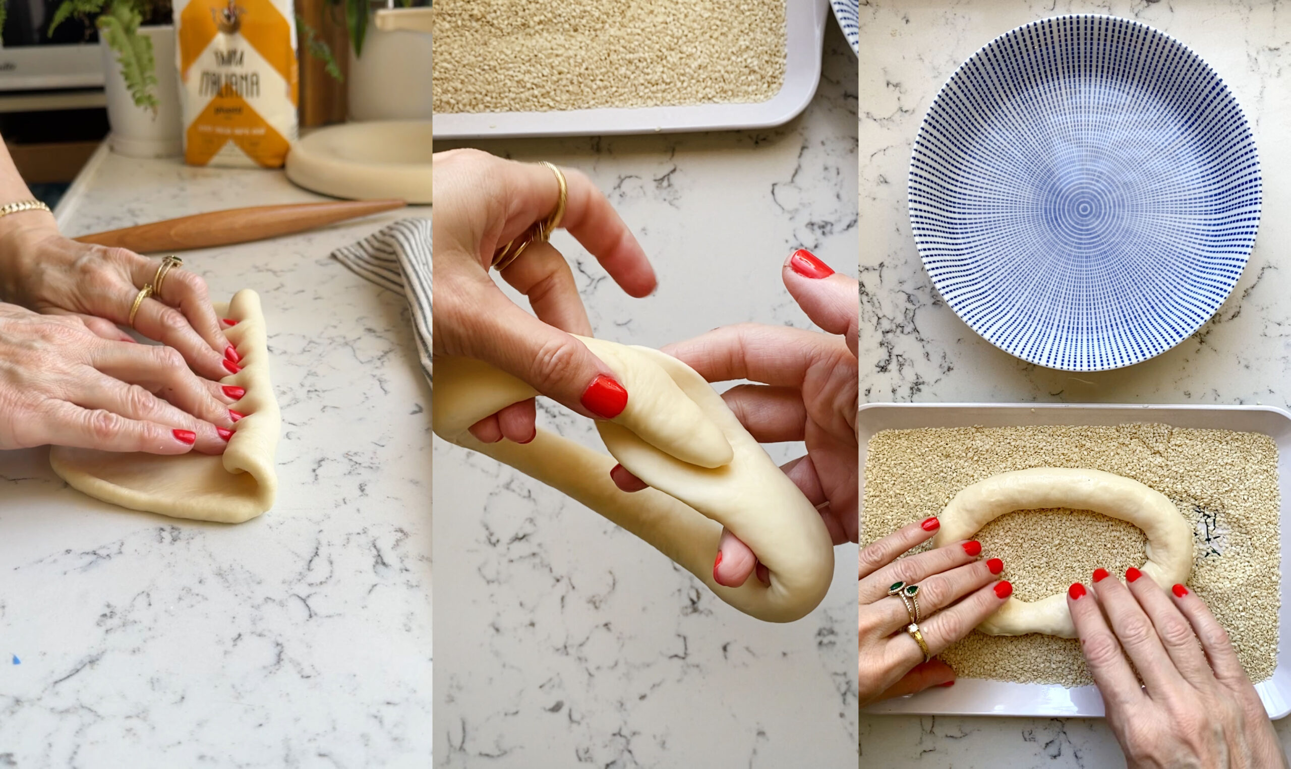 - מגלגלים כל כדור לרצועה ארוכה (ראו סרטון) וסוגרים לצורת בייגלה.
