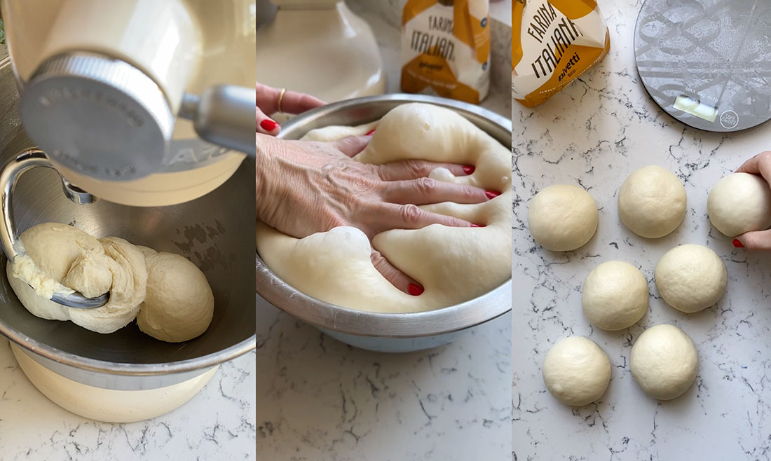 - מחלקים את הבצק ל-7 כדורים שווים, (בערך 125 גרם כל כדור) ויוצרים כדורים חלקים ויפים. שמים אותם על הקרש, מכסים במגבת ומתפיחים כעשרים דקות.