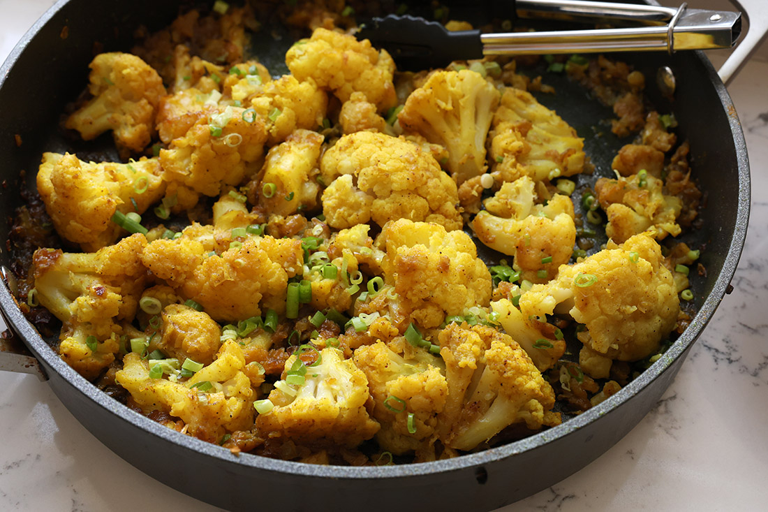 - כשהכרובית רכה היא מוכנה, מפזרים בצל ירוק (או פטרוזיליה) ומגישים.